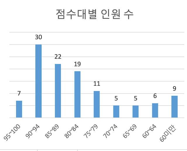 출제자인 나로서는 이런 결과가 나쁘지 않다. 생각보다 평균이 살짝 낮다고 판단된다. 그럼에도 좋은 분포도를 보여주고 있다. 특히 95점이 넘는 학생들의 숫자를 보면 단답형 주관식 시험치고는 나쁘지 않다는 의미이기도 하다.