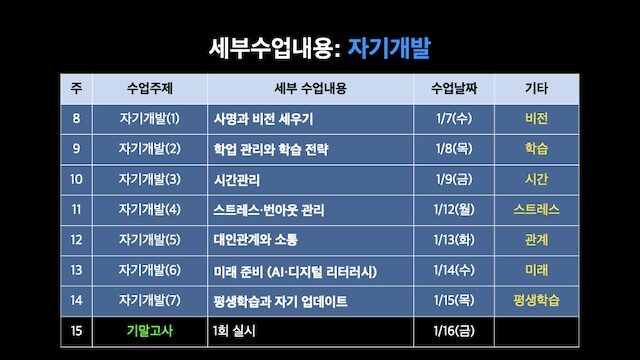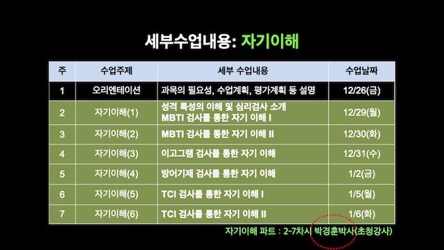 “자기 이해와 개발” 수업은 의예과 1학년 1학기 수업이다. 작년부터 올해 1학기까지 휴학한 학생들을 위한 겨울계절학기의 수업이 시작된다. 이 과목을 담당하던 의학교육학교실의 교수가 토론토대학에 방문교수로 1년간 가는 바람에 하는 수 없이 맡게 된 과목이다. 이미 1학기에 온라인수업으로 강의를 한 바 있다. 이번 계절학기에서는 대면강의를 해야 한다.